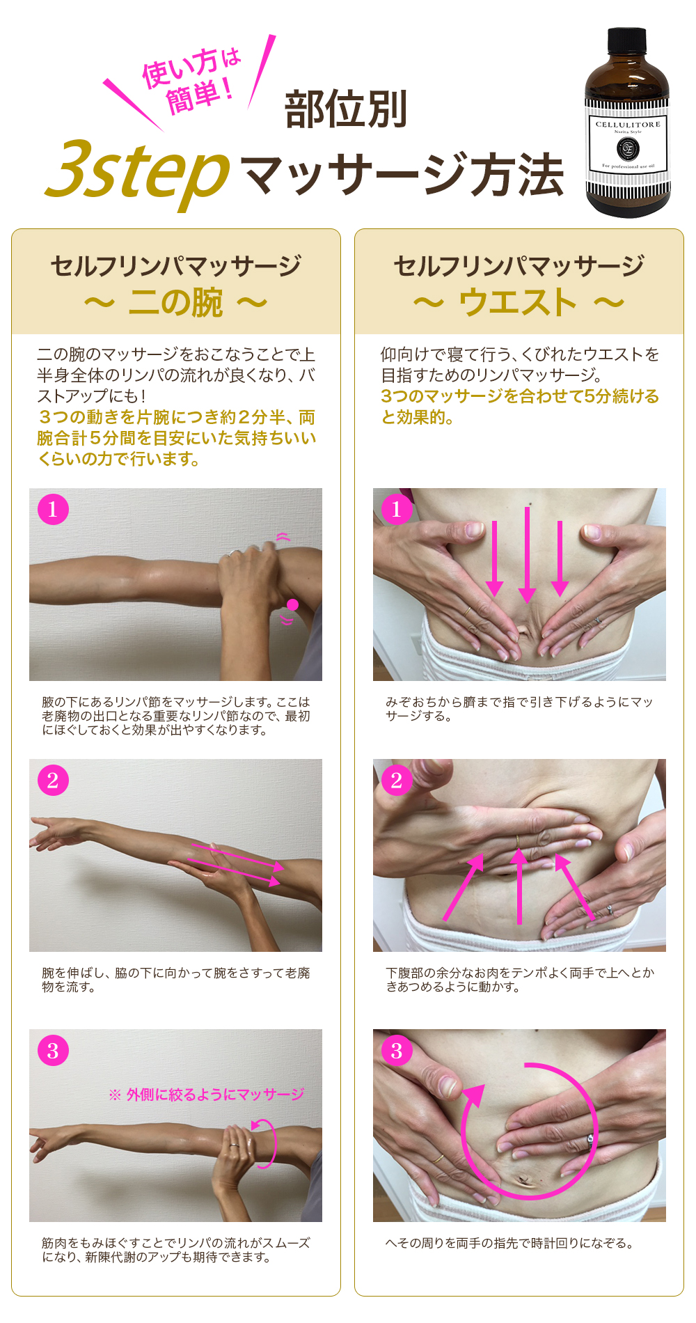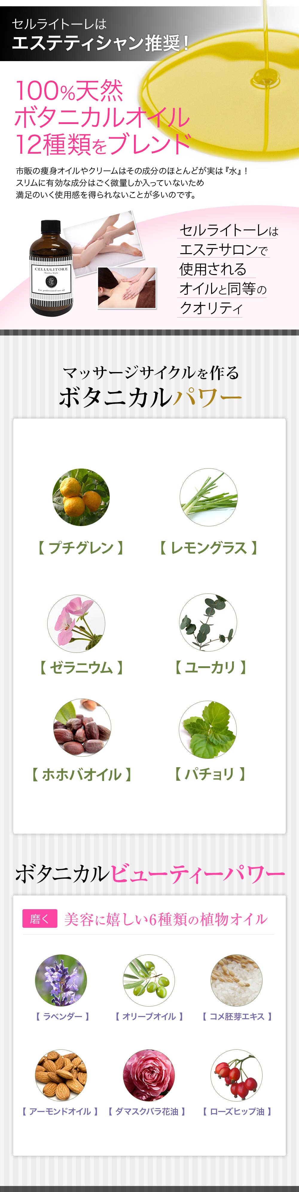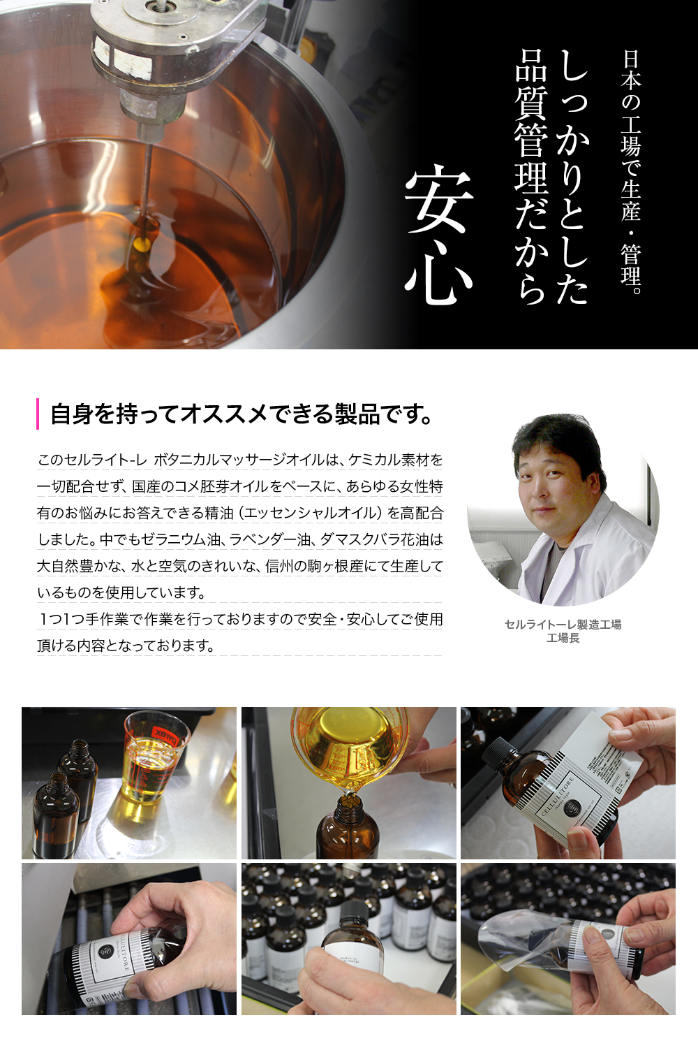 | 成分 | コメ胚芽油、ホホバ油、オリーブ油、アーモンド油、ゼラニウム油、レモングラス油、パチョリ油、プチグレン油、ラベンダー油、ユーカリ油、 ダマスクバラ花油、ローズヒップ油 |