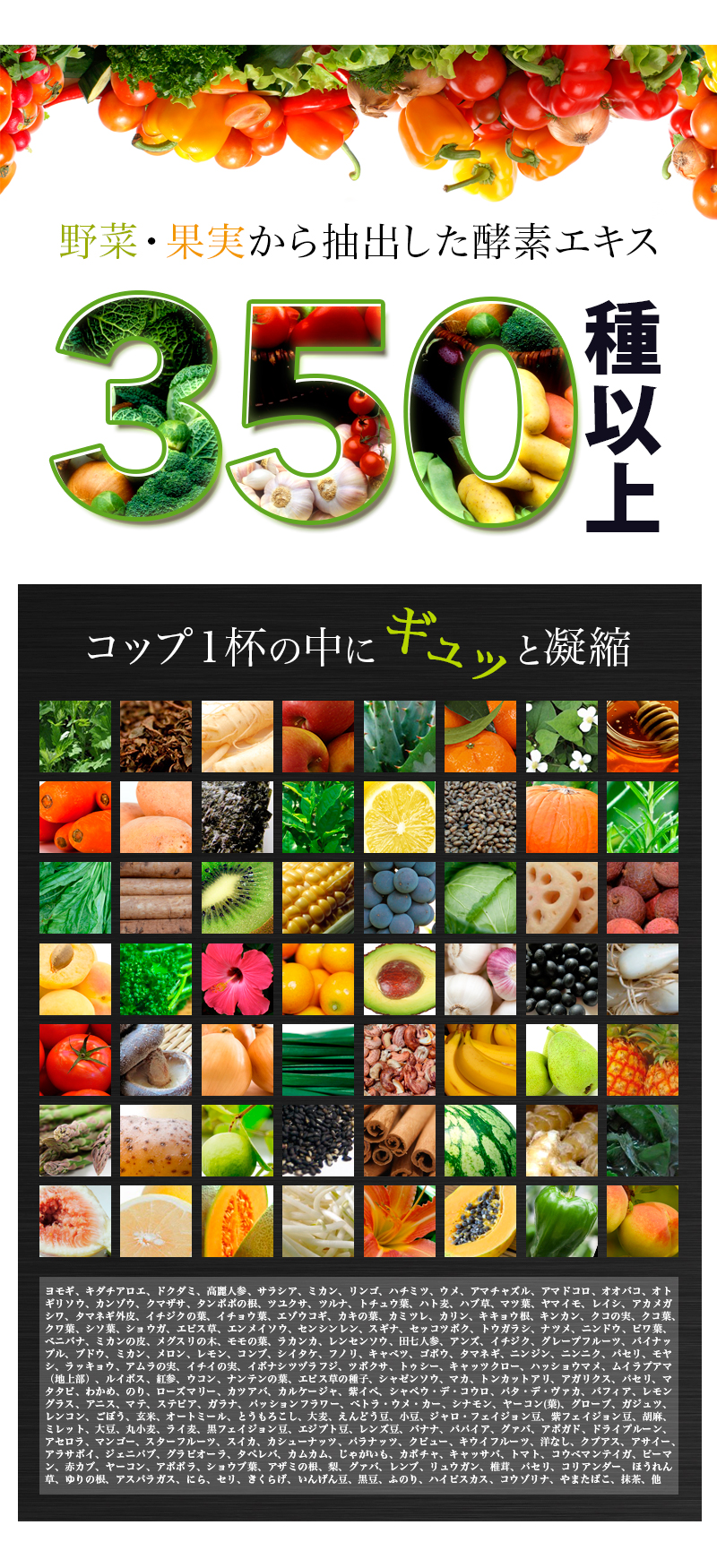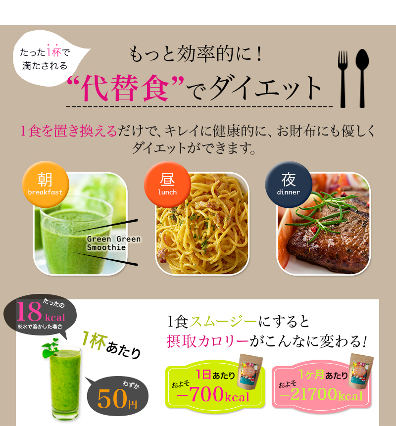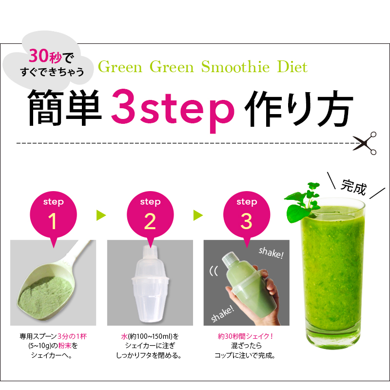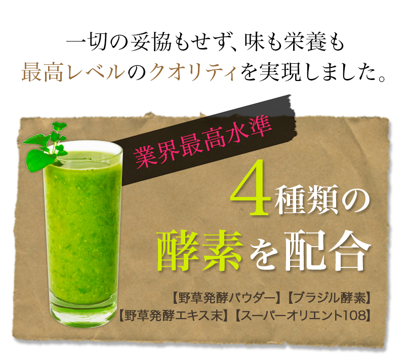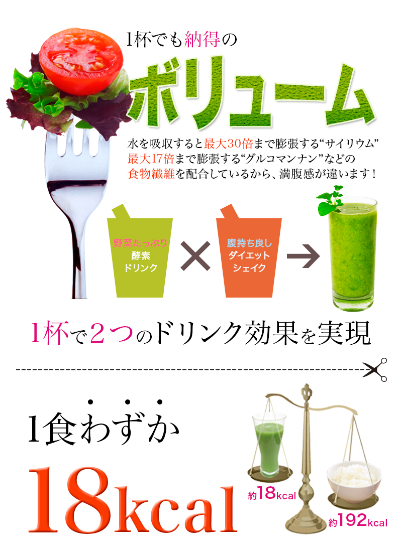 | 原材料 | 水溶性食物繊維、デキストリン、大麦若葉、脱脂粉乳、ドロマイト、玄米、植物混合エキス、食用酵母、L-カルニチンフマル酸塩、サイリウムハスク、キサンタンガム、コンニャクイモ抽出物、クエン酸、香料、甘味料(L-α-アスパルチル-L-フェニルアラニンメチルエステル)、アルギン酸Na、ビタミンC、ナイアシン、ビタミンE、パントテン酸Ca、ビタミンB2、ビタミンB1、ビタミンB6、ビタミンA、葉酸、ビタミンD、ビタミンB12(原材料の一部に 乳、そば、小麦、大豆、やまいも、りんごを含む) |