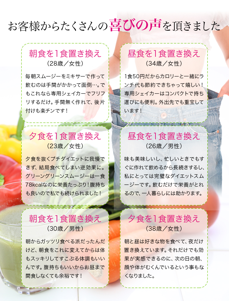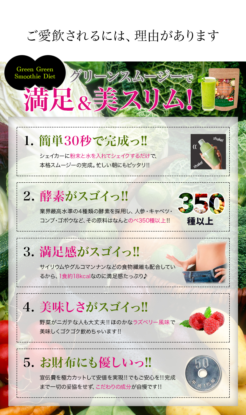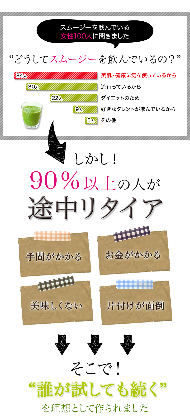 | 原材料 | 水溶性食物繊維、デキストリン、大麦若葉、脱脂粉乳、ドロマイト、玄米、植物混合エキス、食用酵母、L-カルニチンフマル酸塩、サイリウムハスク、キサンタンガム、コンニャクイモ抽出物、クエン酸、香料、甘味料(L-α-アスパルチル-L-フェニルアラニンメチルエステル)、アルギン酸Na、ビタミンC、ナイアシン、ビタミンE、パントテン酸Ca、ビタミンB2、ビタミンB1、ビタミンB6、ビタミンA、葉酸、ビタミンD、ビタミンB12(原材料の一部に 乳、そば、小麦、大豆、やまいも、りんごを含む) |